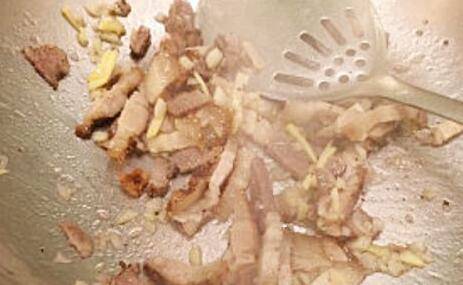 然后把肉丝放进锅里,和蒜末、姜丝一起翻炒出香味。