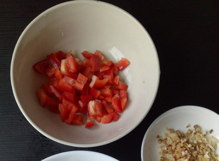 所有食材洗净;甜椒、腊肉切丁;老姜、大蒜切粒;