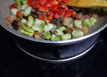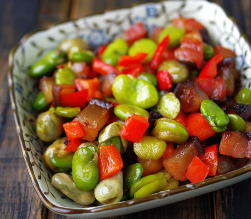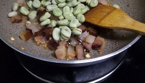 腊肉煸炒至八分熟,放入蚕豆翻炒;