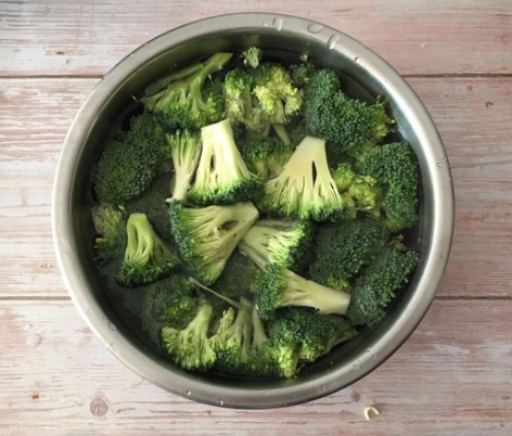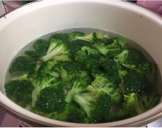 锅内加入水、盐、几滴油煮开倒入西兰花焯烫20秒捞出立刻泡入冷水中过凉;
