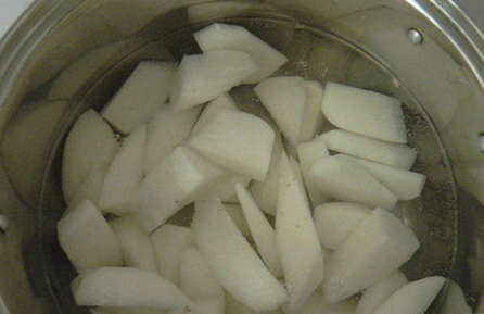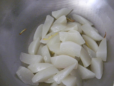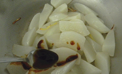 将切好的萝卜入煮锅内焯烫一下,去除萝卜的辣气,捞出后过凉水;