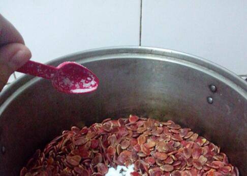 买回来的红瓜子抖抖灰尘后放进煮锅里。